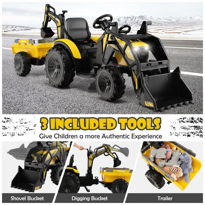 Trator Elétrico 3 em 1 Este veículo de construção elétrico vem com um balde de pá, balde de escavação e reboque. Os pais podem escolher e instalar livremente as peças desejadas para fazer uma escavadeira, uma escavadeira ou um trator, proporcionando às crianças uma experiência mais autêntica.