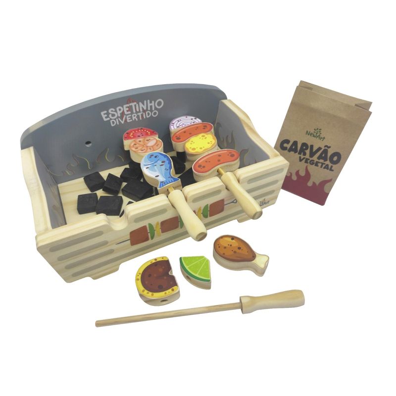 Conteúdo: 1 churrasqueira, 1 saquinho de carvão, 3 espetos e 10 pedaços de alimentos, totalizando 15 peças (ou mais, se for contar os bloquinhos de carvão).