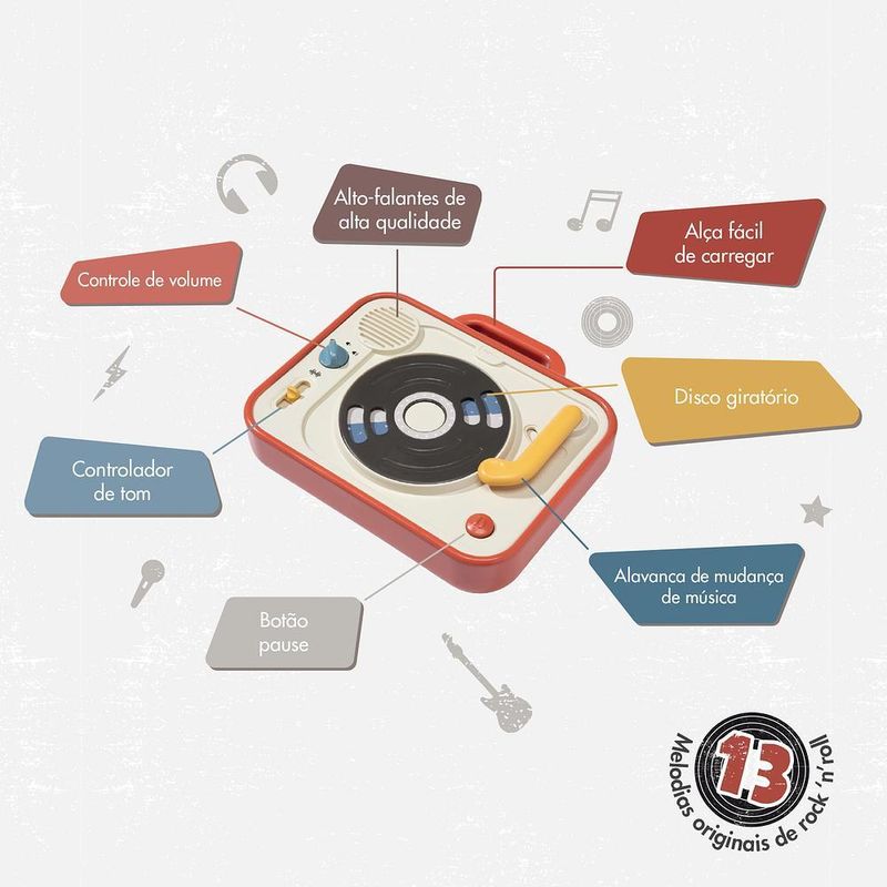 •Alavanca de troca de músicas: Ao mover a alavanca, a criança escolhe entre 13 canções de rock, estimulando habilidades motoras e cognitivas.