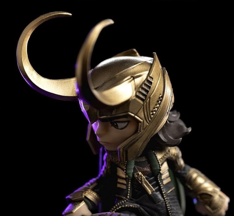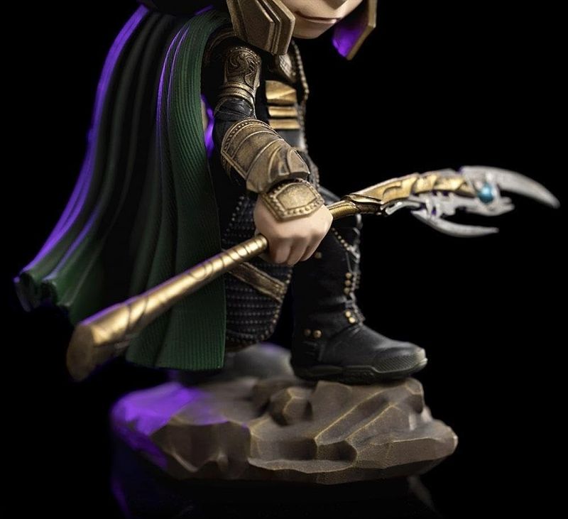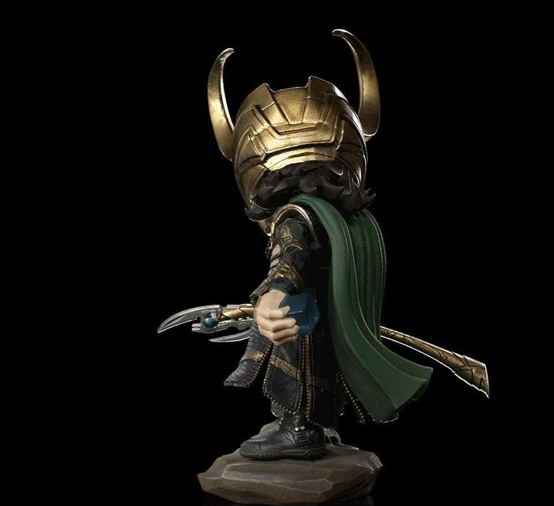 Loki MiniCo tem a armadura asgardiana com detalhes em dourado, uma capa verde, botas e um capacete com longos chifres dourados. Também segura seu Cetro, dado a ele por Thanos. A figura colecionável tem detalhes incríveis tanto nas roupas quanto na expressão facial, que trazem uma sensação de autenticidade e profundidade, além de uma leveza visual que destaca o movimento do personagem.