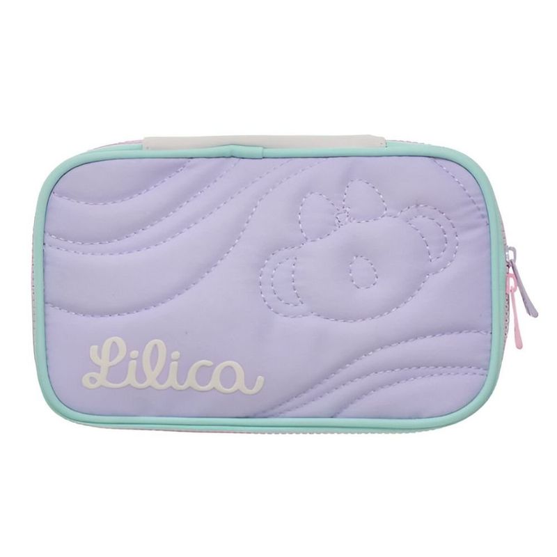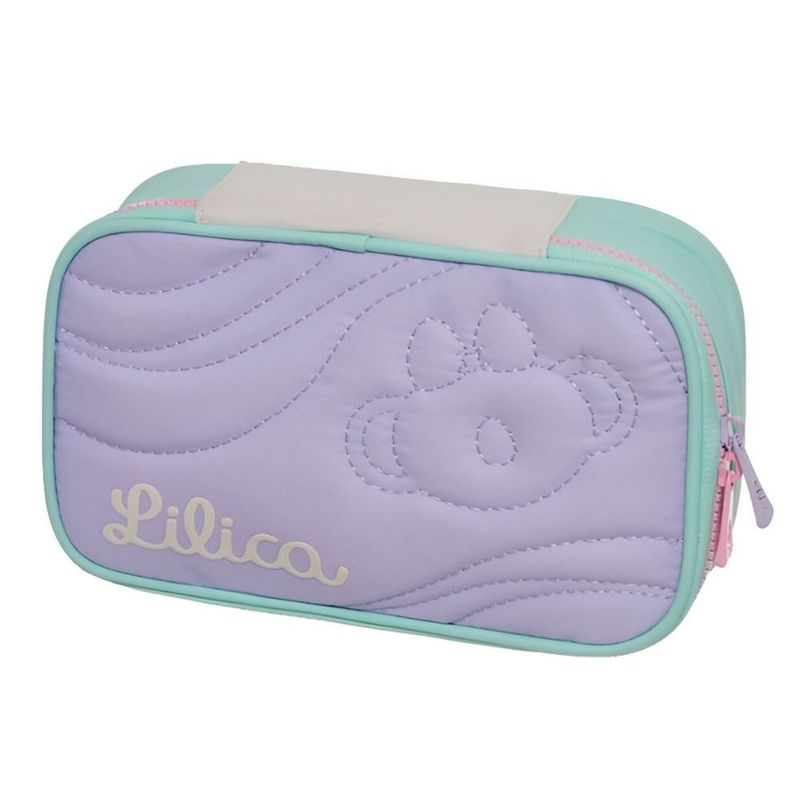 Design Suave e Acolhedor: Com um visual em blocos de cores nos tons de lilás e menta, o estojo traz uma estética moderna e super fofa. O painel acolchoado em matelassê, com o rosto da Lilica bordado, e a escrita da marca em destaque dão um toque de textura e um charme especial ao produto.
