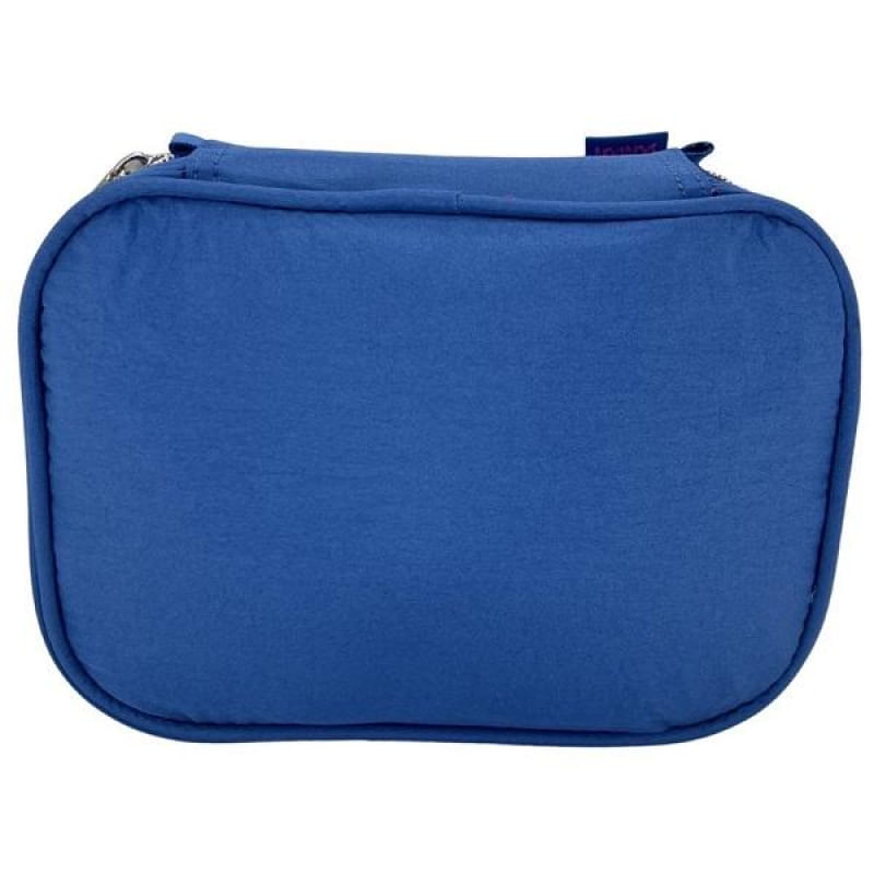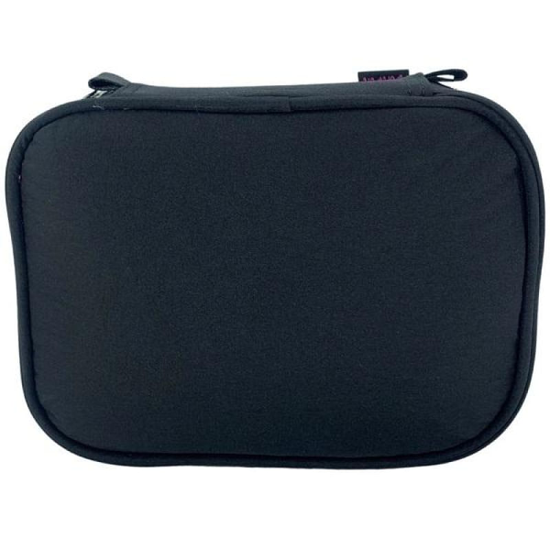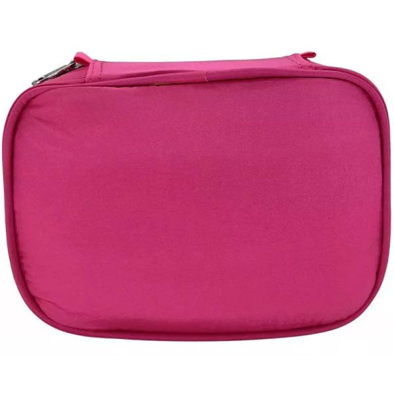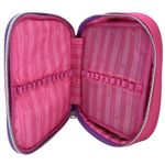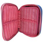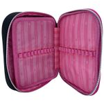 O estojo possui material resistente, amplo espaço interno, uma divisória central com elásticos que auxiliam na organização e um compartimento (estojo interno) com fechamento em zíper.