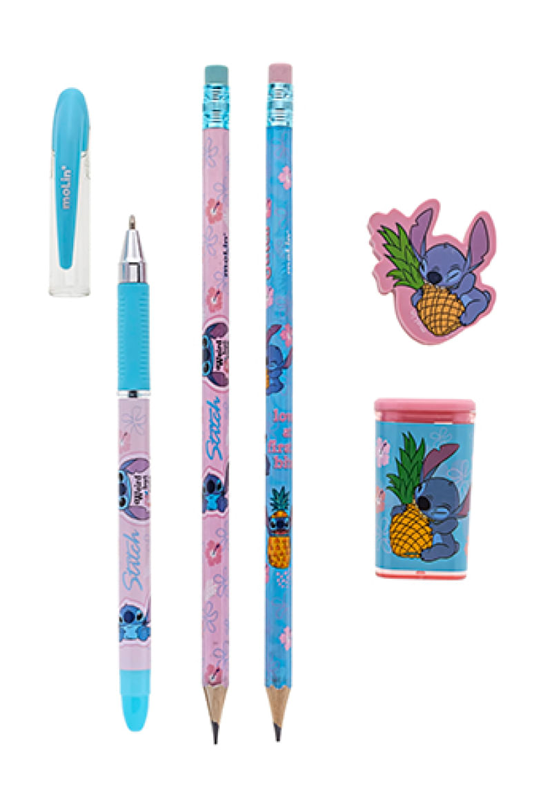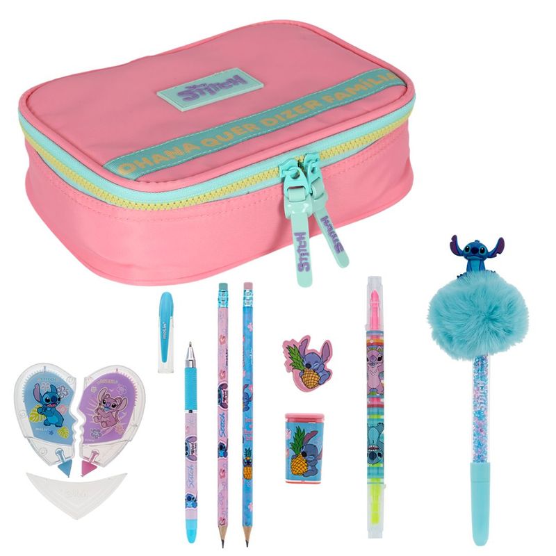 Contém: 01 Estojo Escolar Box Stitch - Luxcel, 01 Fita Corretivo, 01 Caneta Pompom, 01 Marcador de texto, 01 Caneta Estampada Stitch, 02 lápis, 01 Borracha e 01 Apontador- Molin.