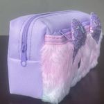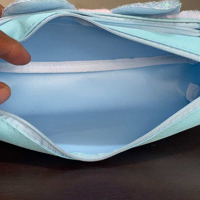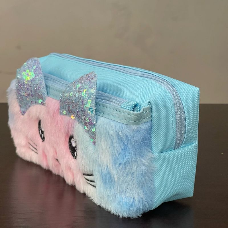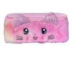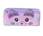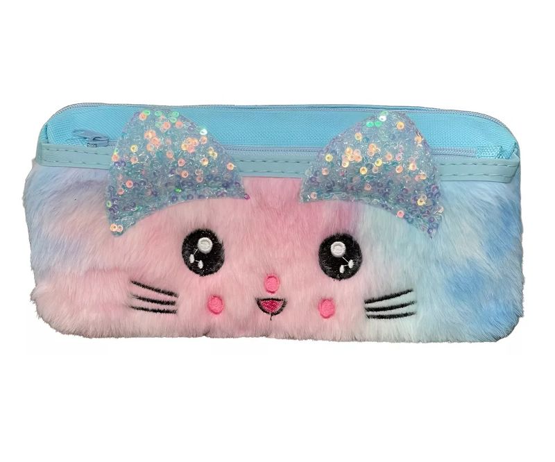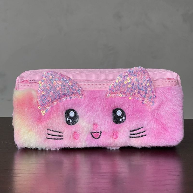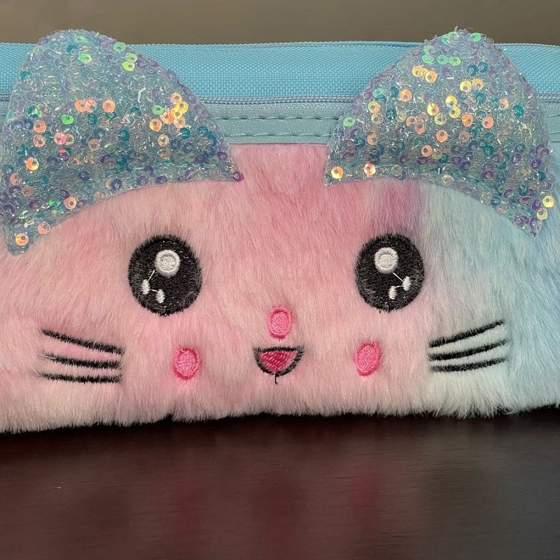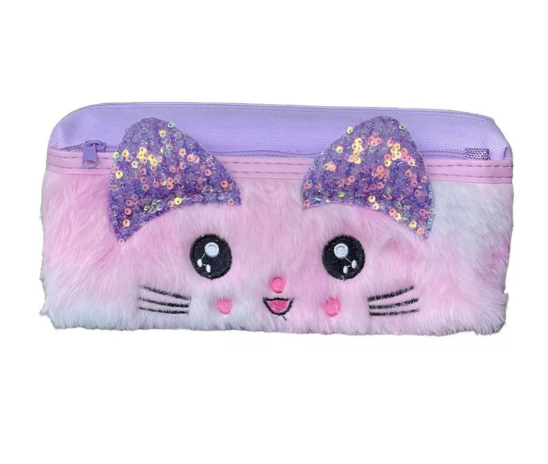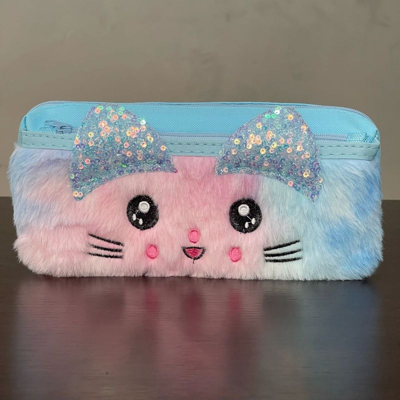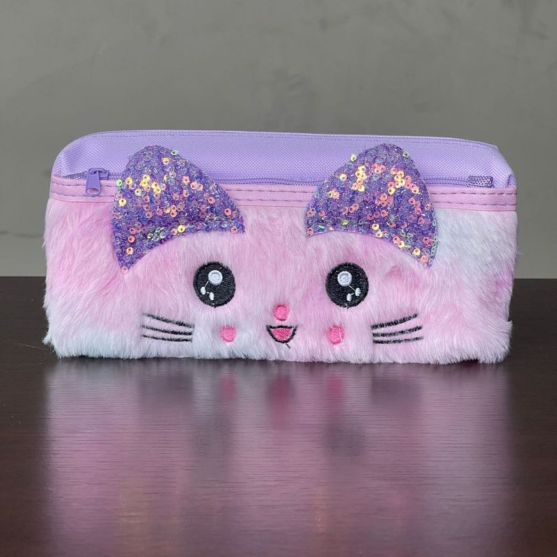 Design Adorável de Gatinho: Apresenta um design exclusivo com o rosto de um gatinho em pelúcia macia, com orelhinhas brilhantes de lantejoulas e detalhes bordados, que adicionam um toque de charme e originalidade ao estojo.