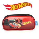 Cores e Contraste: O estojo é predominantemente Preto com a estampa em cores vibrantes como Laranja, Azul e detalhes em Amarelo, que remetem aos veículos Hot Wheels.