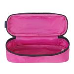 Possui um compartimento que pode ser usado para carregar bastante acessórios escolares como arigos de papelaria ou como nécessaire para pequenos objetos, fechamento em zíper.