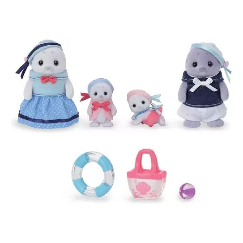 A família Foca tem traços fofos e redondos. Eles têm marcas semelhantes a sobrancelhas, orelhas com covinhas e bigodes ao redor da boca. Este kit contém o pai, a mãe e os bebês, além de acessórios de piscina. Os bebês têm uma textura macia e fofinha. Eles usam roupas lindas em estilo marinheiro. Cada acessório pode ser usado com os bonecos.