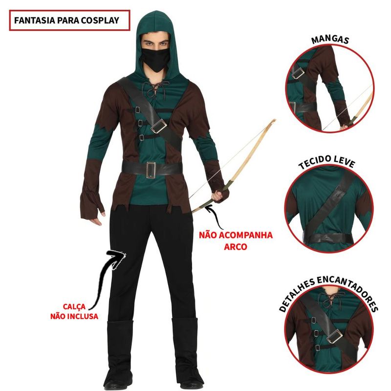 Conjunto Completo: Máscara, casaco com capuz, colete, cintos e sobrebotas Design Autêntico: Visual inspirado em arqueiros lendários. Conforto: Ajustes práticos e material leve Material: Poliester durável e fácil de usar Ideal para Carnaval, festas temáticas e eventos cosplay