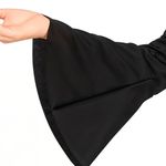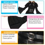 Item Incluso: 1 Túnica/Vestido preto com cintos e fivelas integrados. Estilo Gótico Moderno: Uma peça que une a elegância sombria a um design contemporâneo, com tecido preto fosco. Design Único: Possui mangas boca-de-sino, barra assimétrica e cintura marcada com fivelas metálicas, criando uma silhueta marcante. Toque Misterioso: Ideal para compor diversos looks de personagens para o Dia das Bruxas.