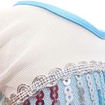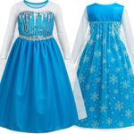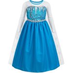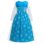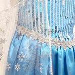 A parte superior do vestido é feita com tecido azul coberto por paetês prateados e azuis verticais, criando um efeito cintilante que remete ao brilho do gelo. As mangas longas de tule branco transparente que possuem elasticidade garante leveza, conforto, sofisticação e delicadeza. O decote redondo azul claro completa o visual com um toque suave e harmonioso. A saia longa e volumosa é confeccionada em tecido acetinado azul, com caimento fluido e toque acetinado que proporciona movimento e brilho a cada passo. Na cintura, um detalhe de renda prateada com brilho adiciona um ar refinado e elegante. A parte das costas possui elasticidade garantindo ajuste perfeito, toda a elasticidade do vestido faz com que o caimento do vestido fique perfeito pois se ajusta ao corpo.