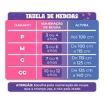 Tamanho P - Numeração de roupa 3 a 4 anos.M - Numeração de roupa 5 a 6 anos.G - Numeração de roupa 7 a 9 anos.GG - Numeração de roupa 10 a 12 anos. Ficou na dúvida de qual tamanho escolher ? Sempre indicamos a escolha de um tamanho maior pois é mais fácil fazer um ajuste, caso necessário. E por ser para criança, a fantasia irá durar por mais tempo conforme ela for crescendo.