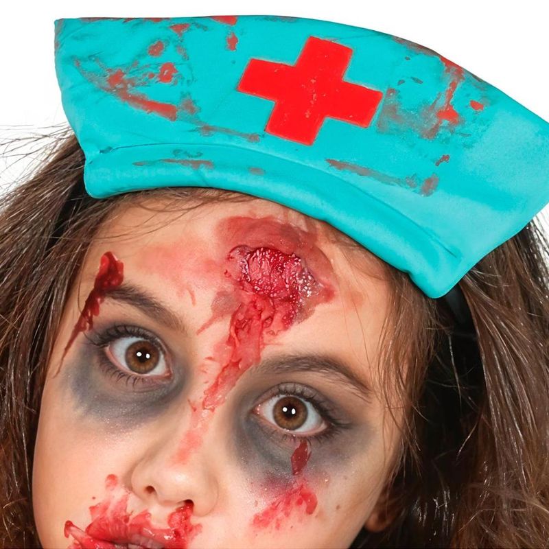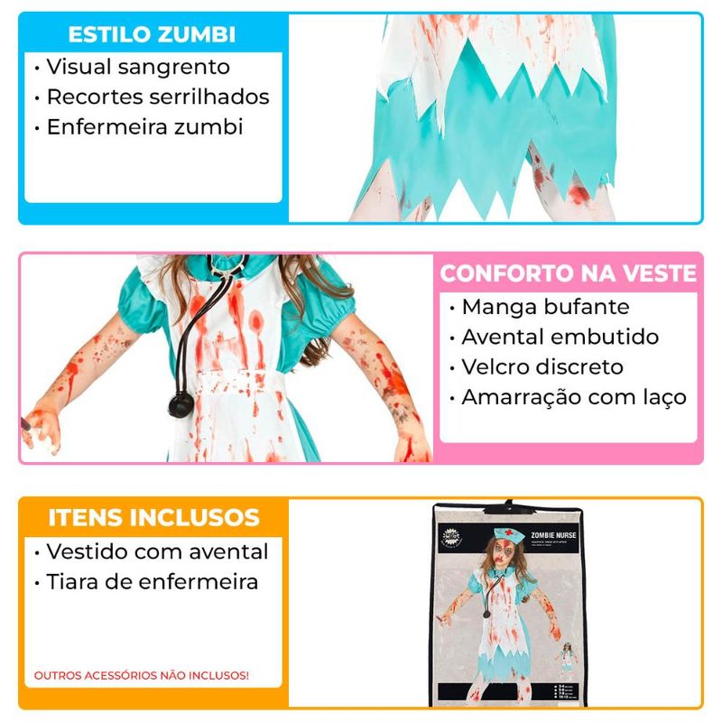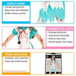 Prepare-se para um Halloween cheio de estilo e arrepios com a Fantasia de Enfermeira Zumbi Infantil! Com um visual impactante e detalhes que fazem toda a diferença, essa fantasia transforma qualquer pequena em uma personagem de filme de terror. O vestido vem com um avental embutido estilizado com manchas de sangue falsas e recortes irregulares que simulam desgaste zumbi. A peça conta com fechamento em velcro nas costas e ajuste na cintura com faixa de amarração, garantindo conforto e caimento perfeito. Acompanha também uma tiara de enfermeira que completa o look sinistro. Destaques do Produto: Estampa realista com manchas de sangue Recortes serrilhados no vestido Tiara e avental embutido no vestido Perfeita para Halloween e festas de terror Velcro nas costas e laço ajustável na cintura Tecido leve com mangas bufantes