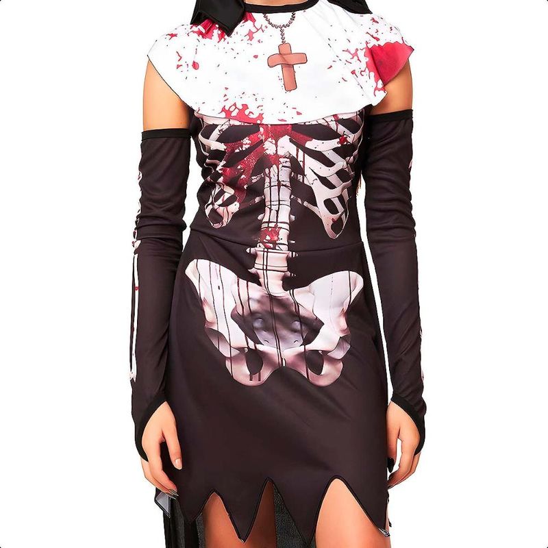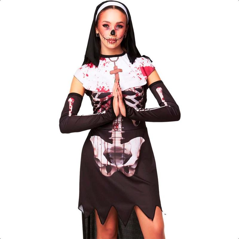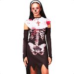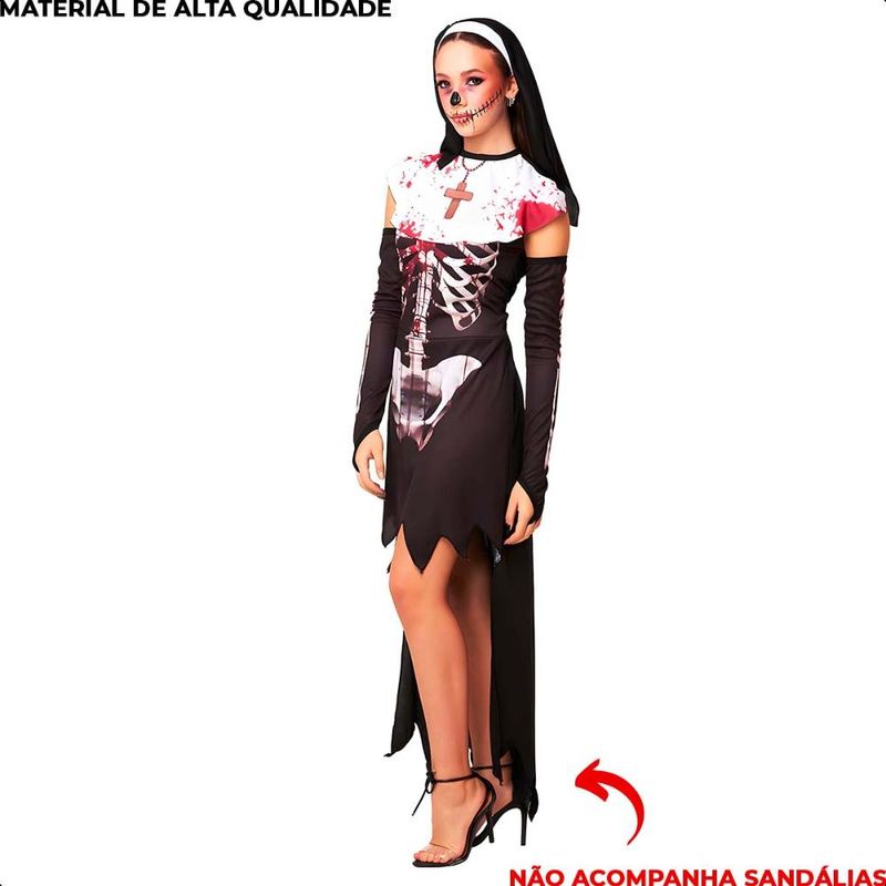 Transforme-se em uma freira assustadora e surpreenda todos na festa com essa fantasia incrível! Nosso vestido conta com uma estampa realista, além de ser super confortável e confeccionado com tecido elástico, garantindo que você possa se divertir a noite toda sem incômodos. Não pinica, não esquenta e ainda te deixa com um visual impecável. Ideal para o Halloween, eventos temáticos ou qualquer ocasião em que você queira arrasar. OBS: Acompanha apenas Vestido e Capuz. Não acompanha sandálias.