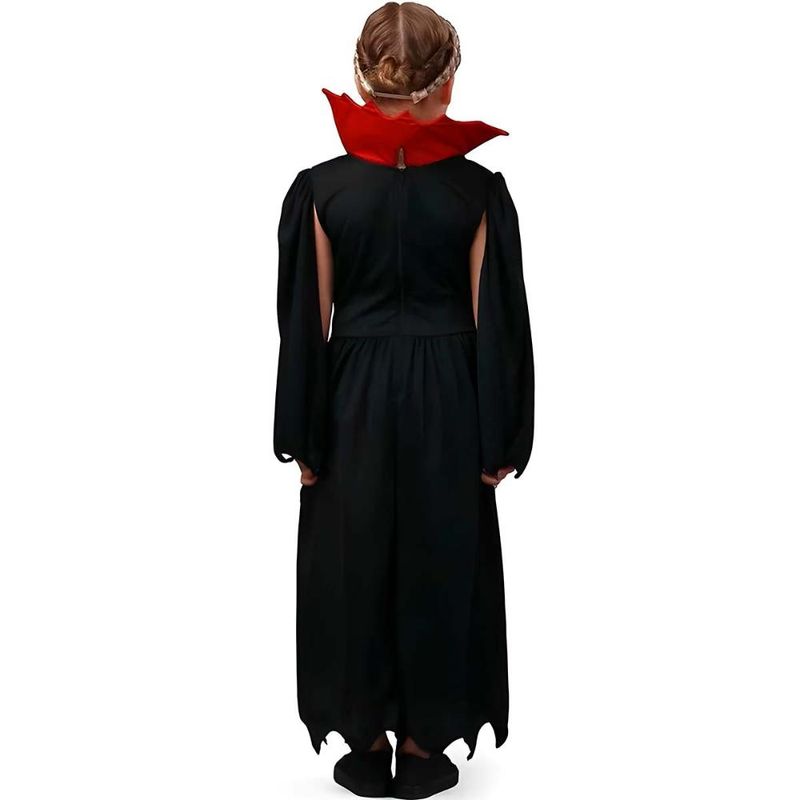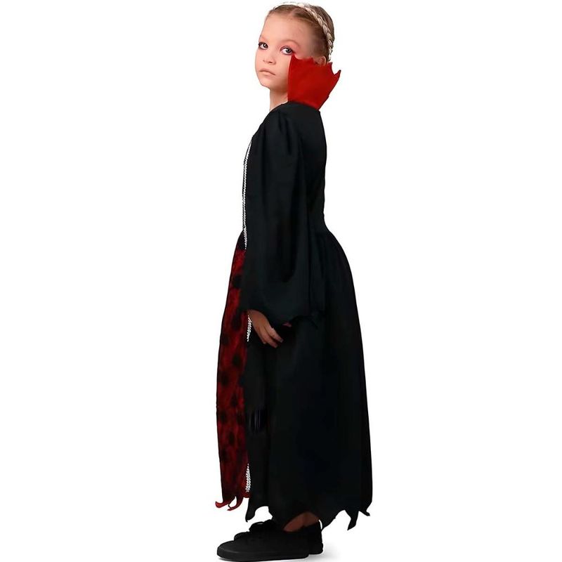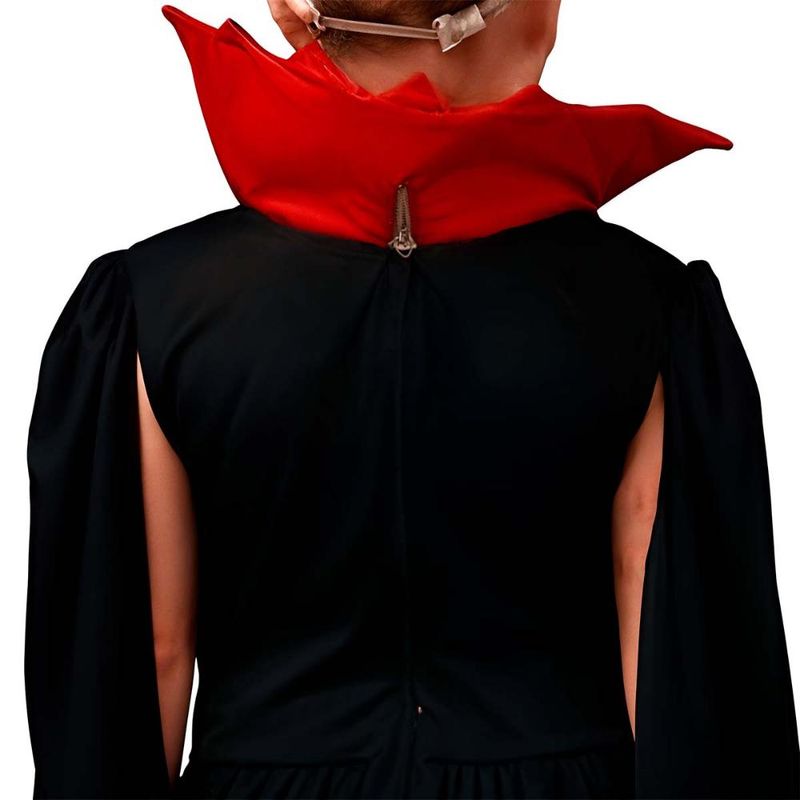 Vestido longo em tons de preto e vermelho possui um design imponente, com detalhes de correntes prateadas que trazem um toque sofisticado. O tecido vermelho com renda preta no centro do vestido cria um visual sombrio e misterioso. A gola estruturada em vermelho vivo adiciona um charme imponente e dramático, ideal para compor o visual clássico dos vampiros. As mangas amplas e fluídas completam o traje, garantindo movimento e elegância. Atrás o vestido se fecha com zíper. Ideal para festas de Halloween, eventos temáticos e momentos de pura diversão, essa fantasia é confortável e fácil de vestir, tornando-se a escolha perfeita para brilhar na escuridão!