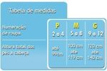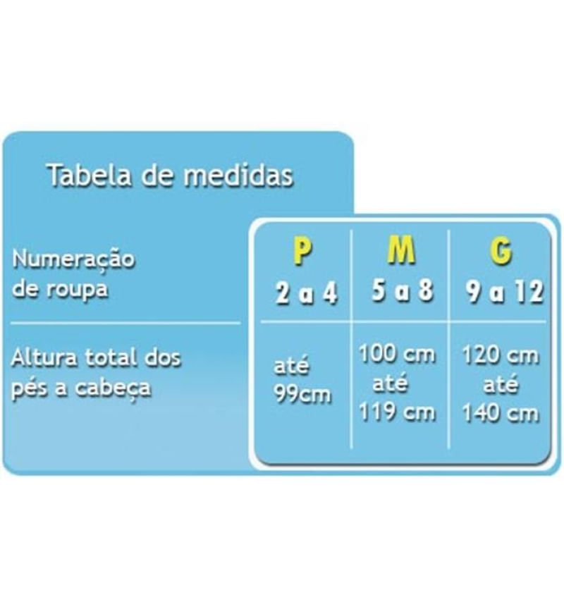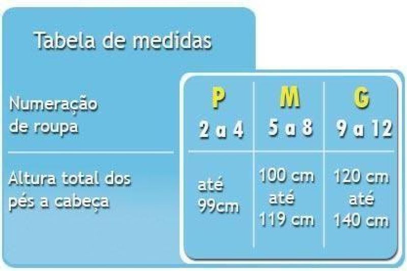 P - Numeração de roupa 2 a 4, para crianças que tenham até 99 cm de altura, dos pés a cabeça.