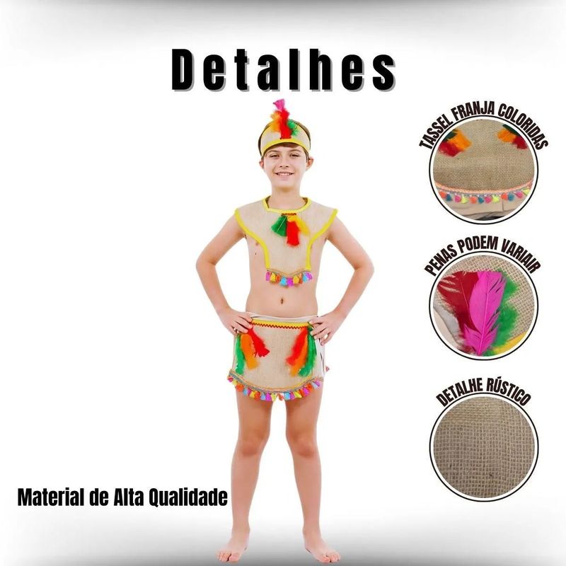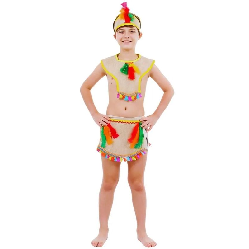 Chegou a fantasia de índio que o seu pequeno tanto quer!Composta por 01 saia de tala com babados laranja e penas fixadas, sua parte interna possui um short bege. 01 Pala também de tala, com bordas costuradas em amarelo e detalhes de penas, e para completar a fantasia acompanha um cocar que combina com a fantasia. Confira!