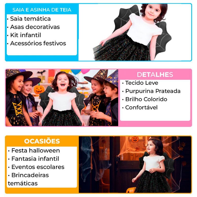 Deixe a fantasia das crianças ainda mais divertida e encantadora com este kit de saia preta com glitter colorido e asinhas de teia de aranha. A saia preta em tule com brilhinhos coloridos traz um toque mágico e festivo, enquanto as asas em formato de teia dão o ar sombrio e perfeito para o Halloween. Ideal para festas temáticas, Halloween, carnaval, apresentações escolares ou brincadeiras de faz de conta, esse kit é leve, confortável e fácil de vestir, garantindo praticidade e muito estilo para os pequenos. Saia em tule com glitter Asas com desenho de teia Fantasia infantil temática Confortável e divertida Veste 6 a 12 anos Saia 30 cm comprimento Asa Grande 55 cm
