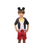 Fantasia do personagem Mickey da Disney, na versão básica , calça curta, mangas curtas, em luxuoso tecido 100% poliéster, acompanha a famosa orelhinha.