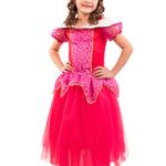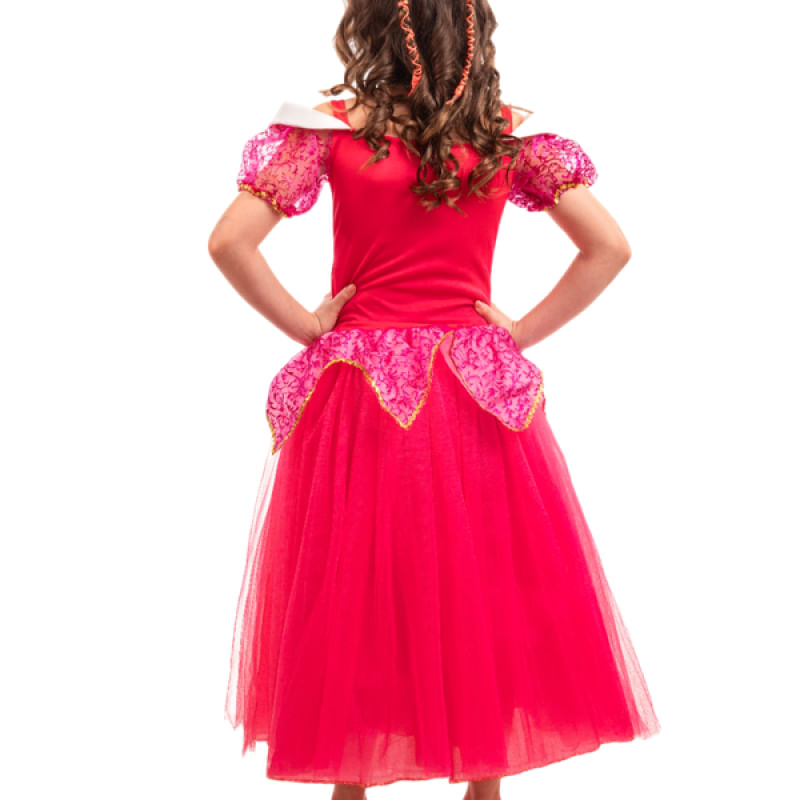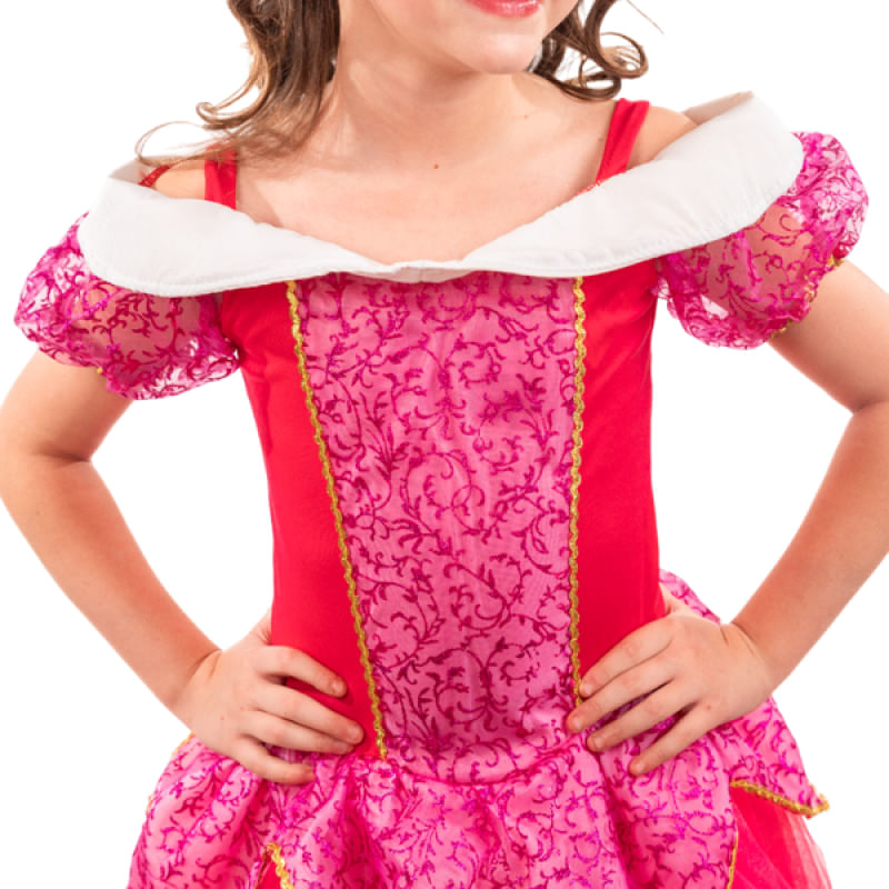 Nossa Fantasia Longa de Princesa Bela Adormecida em Pink é um tributo ao conto de fadas, repleta de detalhes encantadores que farão sua pequena se sentir como uma verdadeira princesa. O corpo superior é feito de helanca, proporcionando uma experiência de uso confortável e elástica. O detalhe de organza glitada e galão dourado adiciona um toque de realeza, enquanto as mangas de organza glitada pink com detalhes de galão dourado elevam ainda mais o visual.