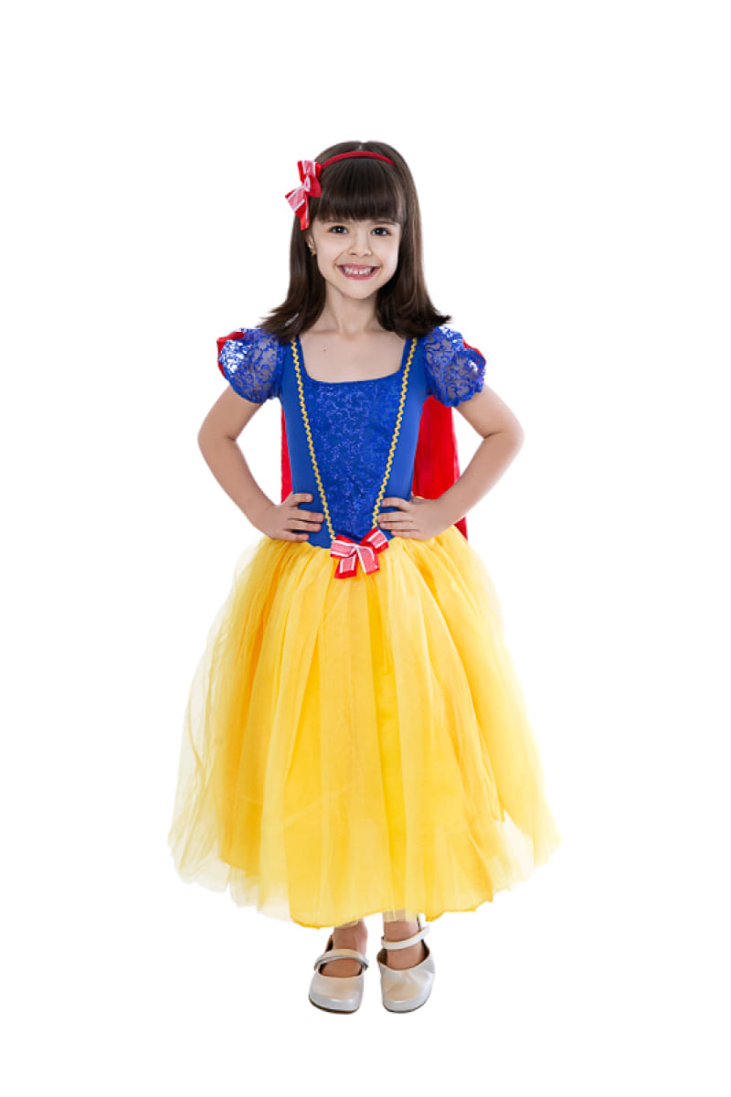 Detalhes Encantadores e Conforto Real: Nossa Fantasia Longa de Princesa Branca de Neve em Azul e Vermelho é uma homenagem à clássica história de conto de fadas, repleta de detalhes encantadores que farão sua pequena se sentir como a verdadeira princesa dos bosques encantados. O corpo superior é feito de helanca, proporcionando uma experiência de uso confortável e elástica. O detalhe de organza glitada e galão dourado adiciona um toque de elegância, enquanto as mangas de organza glitada azul com detalhes de fita vermelha elevam ainda mais o visual. Sobresaia de Tule Amarelo e Saia de Tecido Bember: A sobresaia de tule amarelo cria um lindo volume, adicionando um toque de magia à fantasia. A saia de tecido bember oferece conforto e mobilidade para sua pequena princesa brilhar.