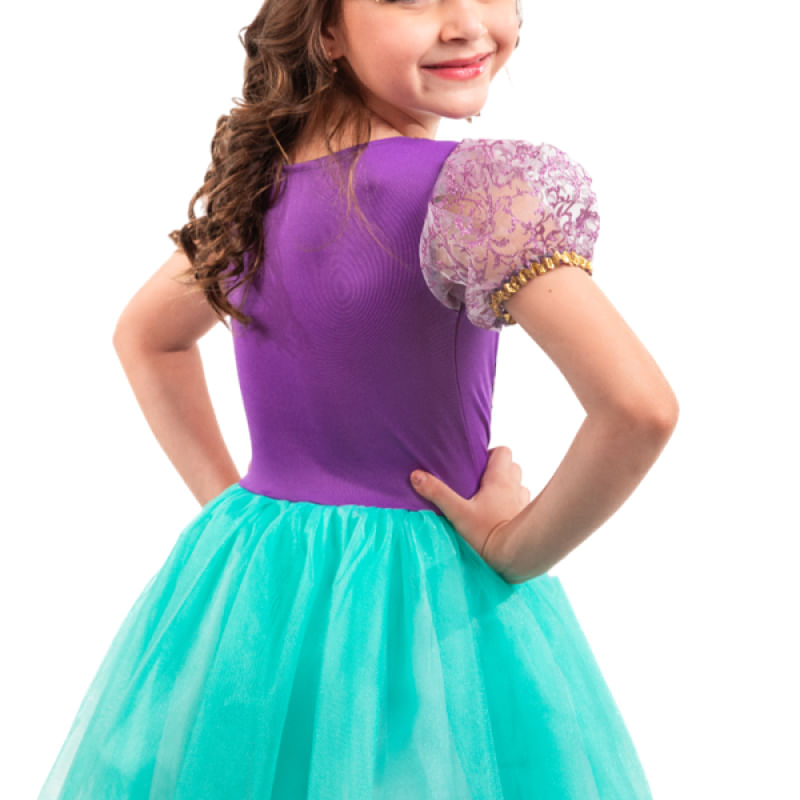 Nossa Fantasia Longa de Princesa em Roxo e Verde é uma promessa de um mundo encantado para sua pequena princesa. O corpo superior feito de helanca proporciona conforto e elasticidade, enquanto o detalhe de tule ombro a ombro e a aplicação de organza glitada com galão dourado no centro do corpo adicionam um toque de elegância.
