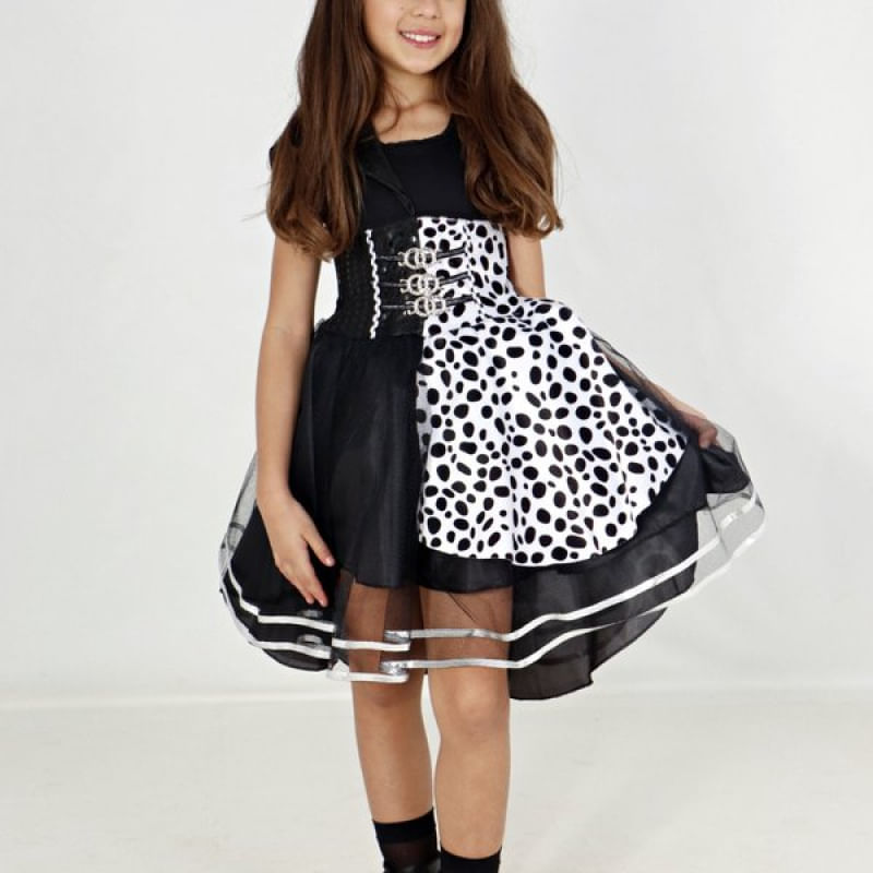 Corpete Meio Paetê, Meio Velboa Branco: O corpete é uma obra de arte em si mesmo. Meio paetê e meio velboa branco estampado com manchas pretas, ele recria fielmente o estilo único de Cruella. Três fivelas pretas imitam os cintos característicos da personagem, acrescentando autenticidade ao visual.