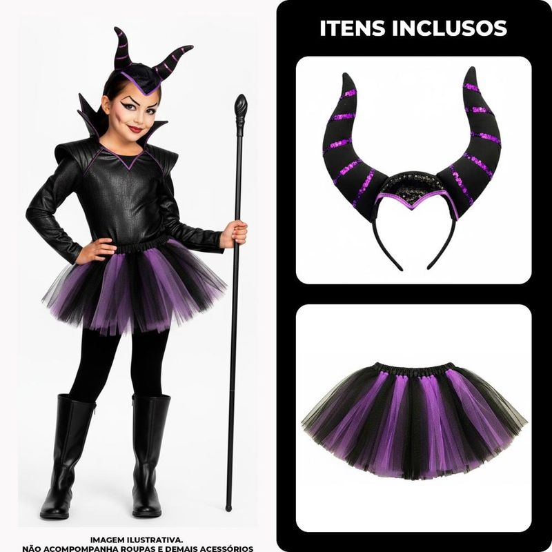 Prepare sua pequena para um Halloween de encanto e mistério com este Kit Fantasia de Malévola Infantil. O kit é composto por uma saia de tule elegante e delicada, nas cores preta e roxa, que possui elástico na cintura para garantir conforto e ótimo caimento. O conjunto é complementado por uma tiara com chifres, produzida com materiais de alta qualidade, trazendo um design autêntico e acabamento refinado. Esta fantasia é ideal para festas de Halloween, Dia das Bruxas, Carnaval, ou para brincadeiras, proporcionando um visual de Rainha Má luxuoso e memorável. É a escolha perfeita para quem busca uma roupa com bom caimento e que seja fácil de vestir.