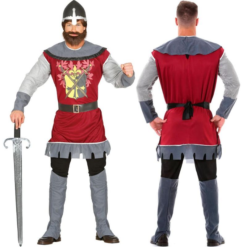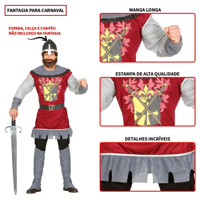 Encante em qualquer evento temático com esta fantasia masculina adulta de Príncipe Medieval. Ideal para festas a fantasia, Carnaval ou eventos temáticos, oferece um visual autêntico e confortável. Feita em poliéster, combina elegância e detalhes históricos. A camisa vermelha possui um brasão central decorativo em amarelo, preto e rosa, além de detalhes que simulam cota de malha nos ombros e mangas. O cinto preto ajustável e as sobrebotas cinzas completam o traje, criando o visual perfeito de um nobre medieval.