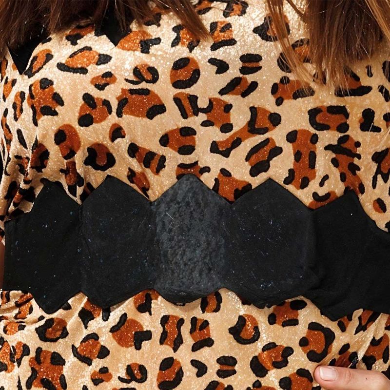 Vestido de fenda mula manca com padrão de onça, trazendo um visual primitivo e estiloso. Recortes triangulares nas mangas e na barra do vestido, reforçando o tema rústico. Faixa de cabeça e sobrebotas combinando, com toque aveludado e padrão de onça. Poliéster com toque suave e aveludado.