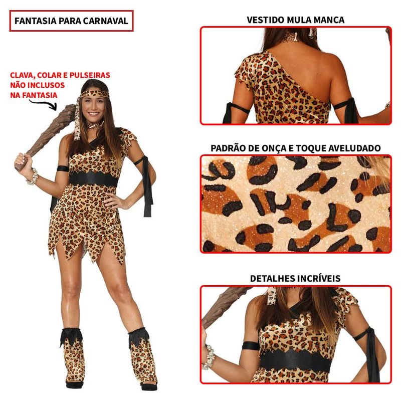 Reviva os tempos das cavernas com a Fantasia Feminina de Troglodita Adulta, perfeita para arrasar no Carnaval, festas à fantasia ou eventos temáticos. Essa fantasia combina charme, conforto e um toque pré-histórico estilizado, trazendo um visual rústico e poderoso. Feita em poliéster com toque aveludado, o traje é pensado para proporcionar um caimento confortável e elegante. O vestido de fenda mula manca, com padrão de onça e recortes triangulares nas mangas e na barra, é ideal para um visual marcante e cheio de estilo. O cinto preto ajustável e as faixas para os braços reforçam o tema primitivo com toques modernos. A faixa de cabeça e as sobrebotas também seguem o padrão de onça, trazendo harmonia ao look.
