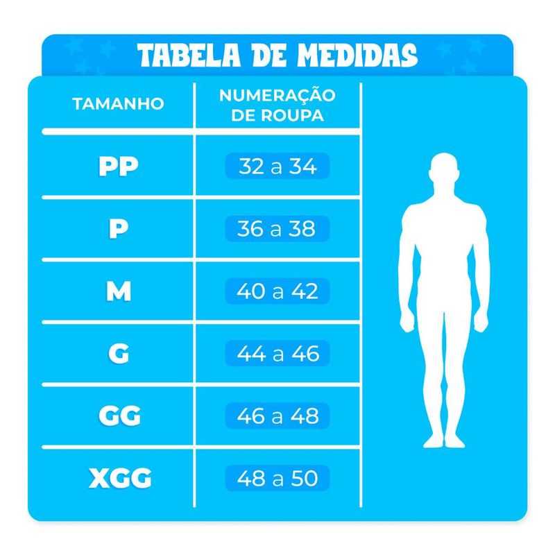 TamanhoPP - Veste Numeração de roupa 32 a 34.P - Veste Numeração de roupa 36 a 38.M - Veste Numeração de roupa 40 a 42.G - Veste Numeração de roupa 44 a 46.GG - Veste Numeração de roupa 46 a 48.XG - Veste Numeração de roupa 48 a 50.Ficou na dúvida de qual tamanho escolher ?Sempre indicamos a escolha de um tamanho maior pois é mais fácil fazer um ajuste, caso necessário.
