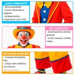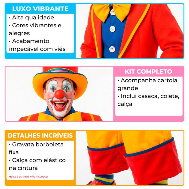 Leve a alegria do circo para o próximo nível com a Fantasia de Palhaço Adulto de Luxo! Este traje completo é a escolha profissional para animadores de festas, recreadores, ou para quem quer causar impacto em festas à fantasia e Carnaval. O conjunto segue o design clássico e elegante de um "Mestre de Cerimônias" divertido. Composto por uma casaca vermelha estilo fraque que traz sofisticação, um colete azul vibrante e uma calça amarela confortável. O visual se completa com uma cartola colorida e estruturada, garantindo a caracterização perfeita. É a combinação ideal de cores vivas e acabamento de qualidade para quem não abre mão do estilo no picadeiro.Kit Completo Design de Luxo Acabamento refinado com viés Conforto e Praticidade Calça com elástico na cintura Colete com botão de pressão nas costas Atenção: Sapatos e meias não estão inclusos.