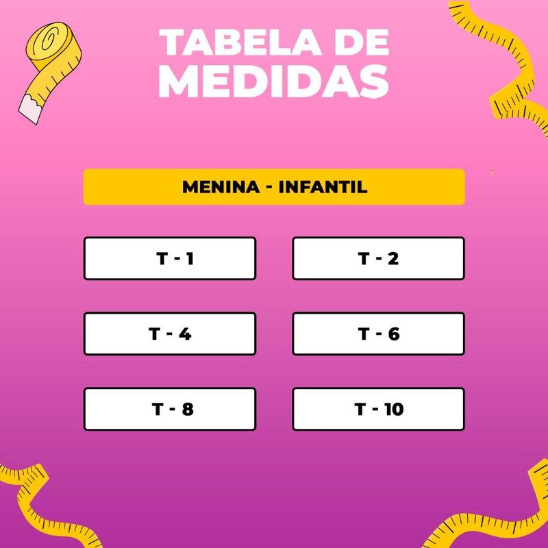 Tamanho T 1 - Veste Numeração de roupa 1 anoT 2 - Veste Numeração de roupa 2 anosT 4 - Veste Numeração de roupa 4 anosT 5 - Veste Numeração de roupa 6 anosT 8 - Veste Numeração de roupa 8 anosT10 - Veste Numeração de roupa 10 anosFicou na dúvida de qual tamanho escolher?Sempre indicamos a escolha de um tamanho maior pois é mais fácil fazer um ajuste, caso necessário.