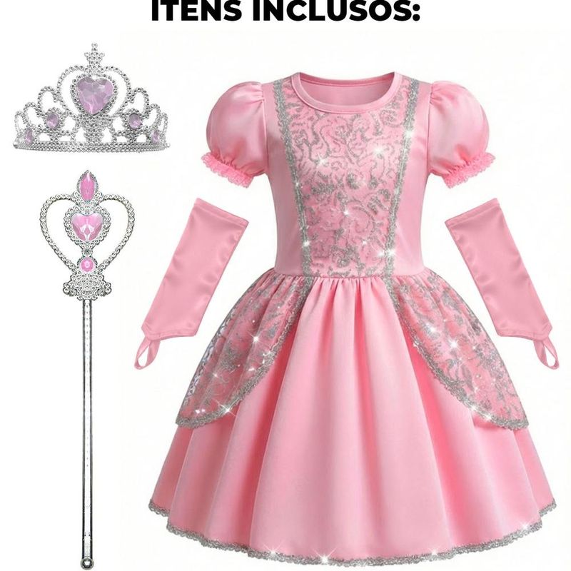 Transforme sua pequena em uma verdadeira realidade com esta encantadora Fantasia de Princesa Infantil Luxuosa! Este kit completo é ideal para festas de aniversário, carnaval ou momentos mágicos de brincadeira. O vestido curto possui um corpete detalhado com bordados arabescos brilhantes e mangas bufantes com acabamento em renda delicada, unindo charme e conforto. A saia em cetim com elástico na cintura garante um ajuste perfeito e um brilho nobre, já seu forro dá volume a saia e não pinica a criança. O conjunto inclui acessórios luxuosos como varinha mágica prateada, faixas para os braços e tiara adornada, proporcionando um visual digno de contos de fadas com total sofisticação.Corpete Arabesco Brilhante Mangas bufantes Acabamento em renda Elástico na cintura ajuste firme e confortável Com Coroa Tiara Com Laço Com Capa Com Luvas
