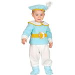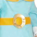 Transforme o seu pequeno em um verdadeiro nobre com esta fantasia para bebê de príncipe, perfeita para festas a fantasia, Carnaval ou eventos temáticos. Feita em poliéster com um toque aveludado, é confortável e charmosa, garantindo um visual encantador. O chapéu azul-claro possui uma pena branca que adiciona um ar sofisticado. A camisa azul-clara conta com gola arredondada branca, detalhes em amarelo nas bordas e um cinto amarelo embutido. A calça branca e as sobrebotas azul-claras completam o visual digno de realeza.