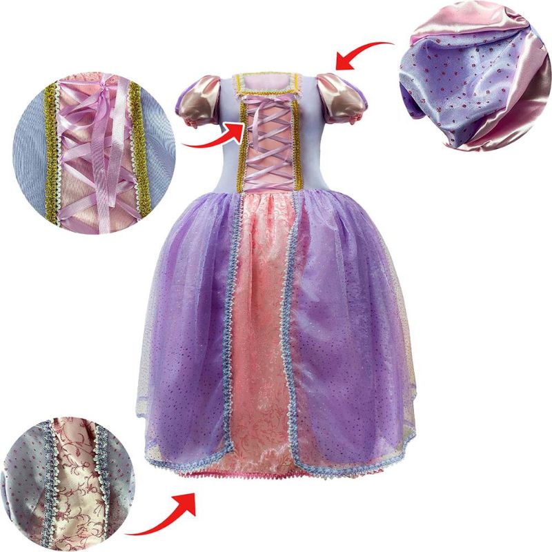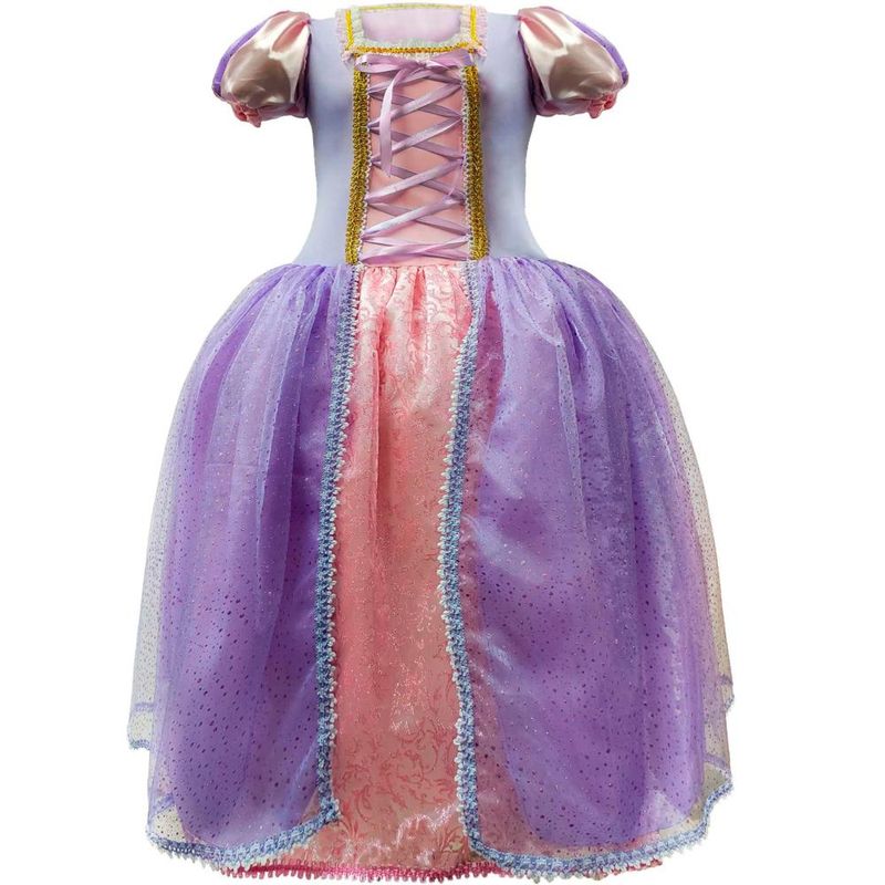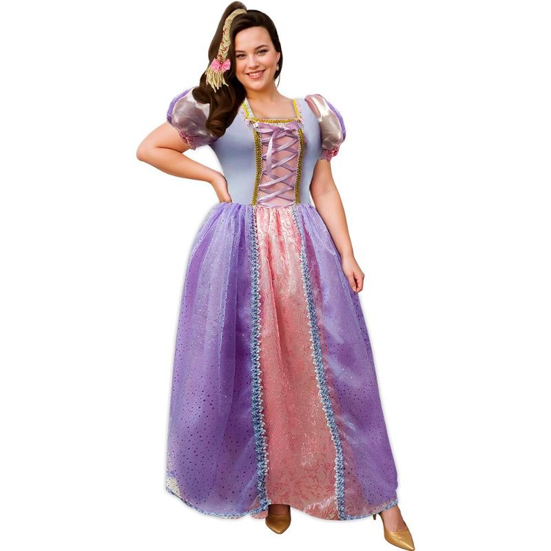 Maravilhosa fantasia de Princesa Rapunzel, composta por um vestido longo modelo Plus Size rico em detalhes, seu corpo de helanca é elástico e super confortável, a gola possui detalhes luxuosos em guipir e galões, no busto passa fitas super resistentes e galões, suas mangas bufantes com gominhos e detalhes em organza glitada e punho em helanca para não apertar os braços. Sua saia longa com tecido transparente brilhante, possui guipir em todo seu redor trazendo sofisticação e luxo, acompanha sobressaia para que fique muito volumosa como uma princesa. Para deixar a sua fantasia ainda mais completa, acompanha uma linda tiara com trança cheia de pedraria!