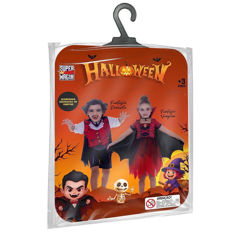 Fantasia Vampira tamanho g da novabrin, espalhe o charme misterioso neste Halloween com essa fantasia completa com vestido, capa e dentadura, perfeita para criancada se divertir nas festas com muito estilo e toque de elegância e mistério, disponível no tamanho G (veste de 9 a 12 anos).