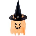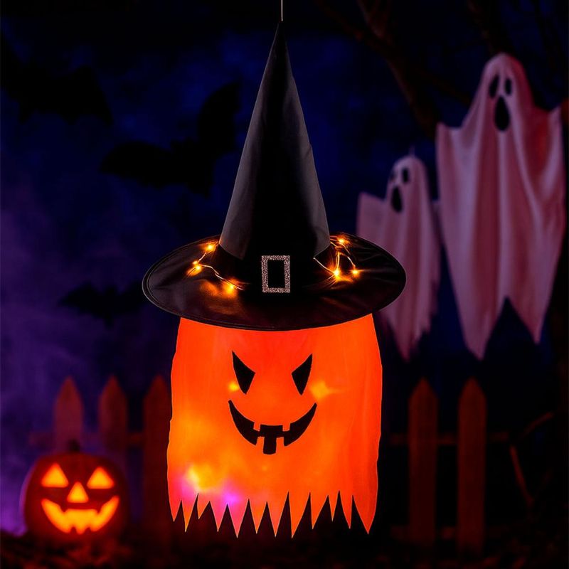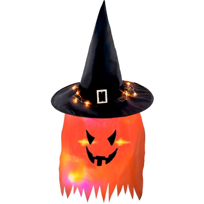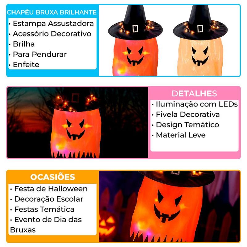 Dê um toque mágico e assustador à sua decoração com o Enfeite Chapéu de Bruxa com Cara Fantasmagórica. Produzido em material leve e durável, é ideal para pendurar em paredes, portas, varandas ou até mesmo em ambientes internos, criando um clima de mistério. O enfeite conta com iluminação em LED que acende no escuro, tornando o visual ainda mais marcante e temático. Prático e impactante, é perfeito para transformar qualquer espaço em um cenário digno de Halloween. Destaques do produto: Fivela decorativa Rosto assustador LED que acende Enfeite de Pendurar Leve e resistente