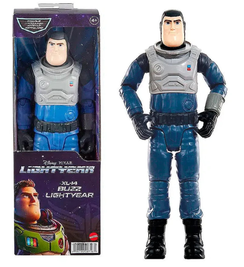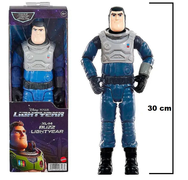 A figura de ação Buzz Lightyear XL-14 é um boneco grande e articulado, projetado para recriar as aventuras do filme Lightyear da Disney e Pixar. Especificações Principais: Modelo: Buzz Lightyear XL-14. Fabricante: Mattel. Número do Modelo/Item: SKU HJJ26 (HHK07número da linha de produtos). Altura: Aproximadamente 28 cm a 30,5 cm (11 a 12 polegadas). Articulação: Possui entre 12 a 14 pontos de articulação móveis, permitindo uma variedade de poses dinâmicas. Material: Principalmente plástico resistente. Acessórios: Geralmente inclui acessórios específicos do filme, como um capacete removível e, em algumas versões, uma pistola de sinalização (flare gun) que se encaixa na mão ou no quadril do boneco. Idade Recomendada: Para crianças a partir de 4 anos de idade. Características Adicionais: A figura é detalhada e inspirada diretamente no visual do filme, mas não possui recursos eletrônicos como luzes ou sons nesta versão específica. Esta figura é ideal tanto para fãs jovens que desejam reviver as cenas do filme quanto para colecionadores, devido ao seu design autêntico e capacidade de pose.