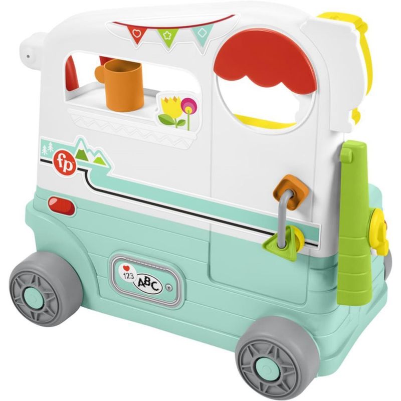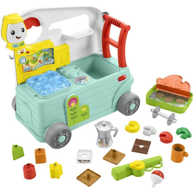 O Rir e Brincar 3 em 1 – Trailer mantém a diversão emocionante enquanto seu pequeno aventureiro passa da fase de sentar para se envolver com atividades mais agitadas, caminhar e empurrar, criando aventuras imaginárias de acampamento. Este centro de atividades musical tem 3 níveis de aprendizado Smart Stages™ cheios de músicas, sons, luzes e frases divertidas sobre letras, cores, contagem e formas, além de 10 peças removíveis para dar vida à brincadeira de acampamento.