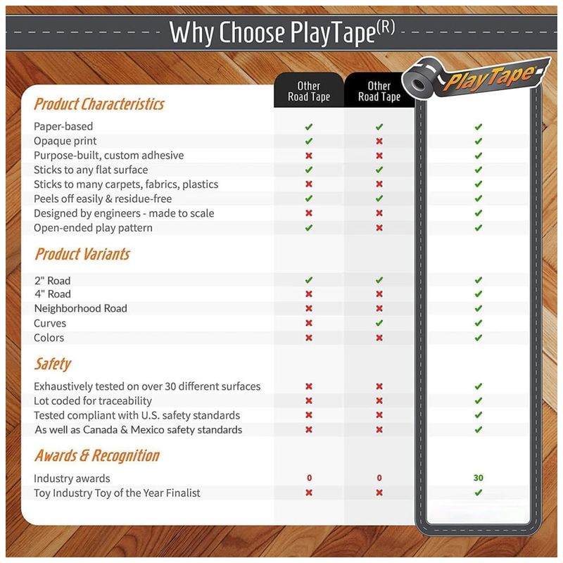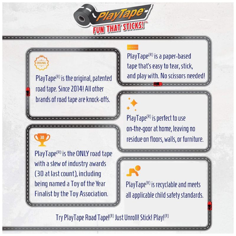 É perfeito para construir estradas de brinquedo instantâneas, rodovias e pistas de corrida em qualquer superfície plana, a qualquer hora e em qualquer lugar. Compatível com seus caminhões de carros de brinquedo existentes, a fita adesiva original PlayTape é simples de usar e perfeitamente dimensionada para uma criança manusear com facilidade. As estradas PlayTape são projetadas de acordo com especificações exatas e podem ser facilmente rasgadas com as mãos e reposicionadas. Adicione curvas conectando estradas PlayTape com curvas PlayTape. A fita adesiva PlayTape é segura para o seu filho e para sua casa, pois é à base de papel, portanto não é necessária tesoura sem látex. Ela é segura para pisos, paredes e móveis, descascando sem deixar resíduos. O PlayTape atende a todos os padrões de segurança infantil aplicáveis e é reciclável. O PlayTape já ganhou 30 prêmios do setor, incluindo o prêmio Academics Choice Brain Toy e o Dr Toys 10 Best.