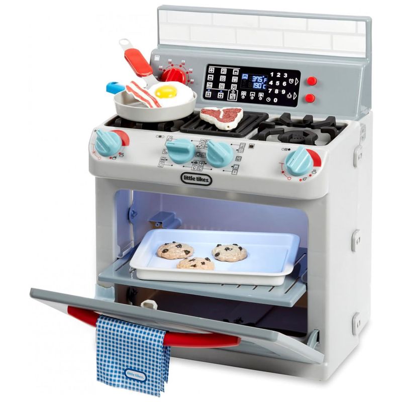 ROLE PLAYING DE COZINHA REALISTA Este forno está repleto de sons realistas queimadores acendendo, água fervendo, chiando e temporizadores tocando. Outros recursos realistas incluem as luzes do fogão, os botões realmente funcionam, a luz do forno acende quando a porta é aberta, a prateleira do forno é removível e os mostradores do queimador giram