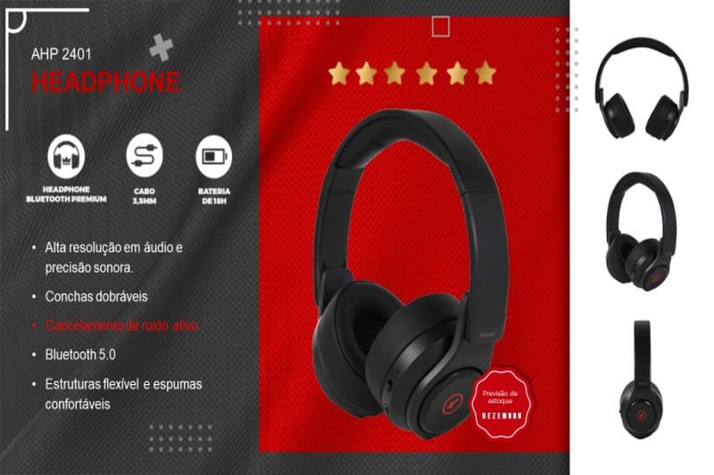 HEADPHONE BLUETOOTH PREMIUM • CANCELAMENTO DE RUÍDO ATIVO • CONCHAS DOBRÁVEIS • CABO 3,5 MM INCLUSO • BATERIA DE 18 HORAS DE DURAÇÃO • ALTA RESOLUÇÃO EM ÁUDIO E PRECISÃO SONORA • ESTRUTURA FLEXÍVEL E ESPUMAS CONFORTÁVEIS PERMITINDO USO PROLONGADO • BLUETOOTH 5.0