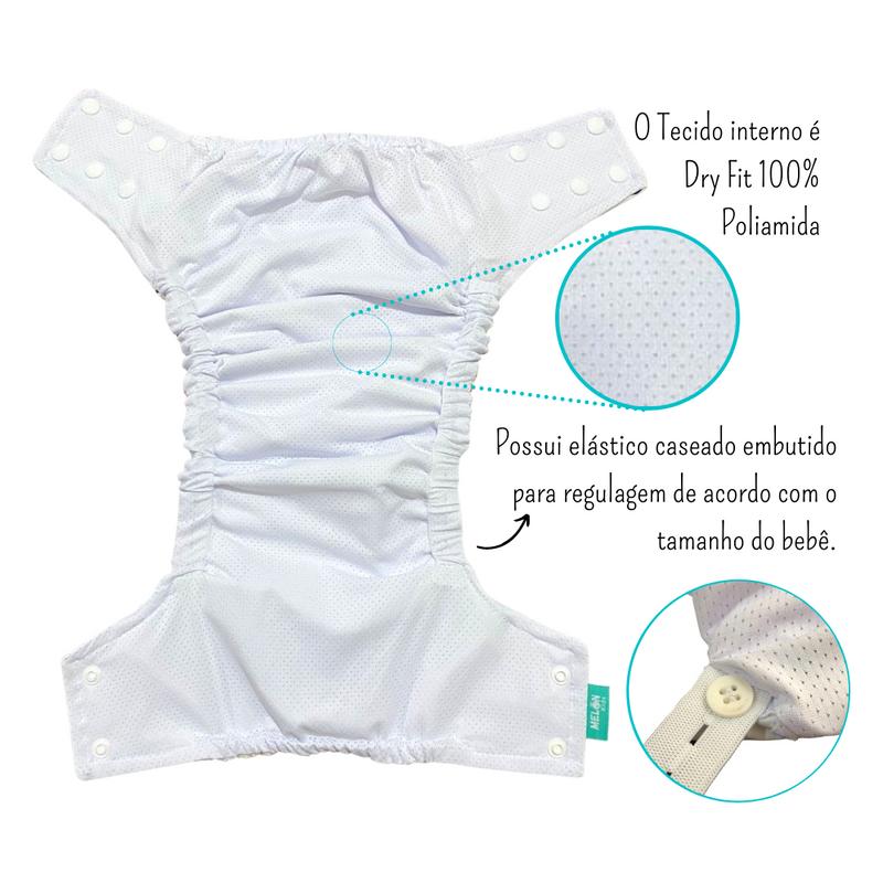 Composta por 1 Capa/Pocket que você pode customizar com os variados tipos de absorventes adaptando-se conforme a necessidade e fases do desenvolvimento do seu bebê.