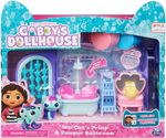 Tenha um dia relaxante de SPA com MerCat no banheiro da Gabbys Dollhouse. Este Playset de luxo da Gabby é cheio de detalhes divertidos e surpresas para explorar, trazendo o cômodo mágico do show para a vida real. Abra a calxa para encontrar um boneco colecionável MerCat, três peças de móvels, um acessório de gatinho de pato de borracha, além de duas caixas de entrega para casa de bonecas com mais dois acessórios surpresas! Assim como Gabby faz no início de cada episódio, desembrulhe suas entregas especiais e descubra os acessórios misteriosos do conjunto: uma garrafa de perfume e uma toalha com uma máscara de pepino que à MerCat pode realmente usar! Desiize o envoltório na cabeça da Mercat e coloque-a na banheira com seu gatinho de borracha para um banho de bolhas calmante. Quando você empurra para baixo na banheira, as bolhas se movem! É muito divertido! Remova o envoltório e coloque-o no carrinho de banheiro do gatinho para facilitar o armazenamento, depois vá para a penteadeira. Gire o espelho da pia para revelar uma linda cena subaquática! Para uma última surpresa, leia o código QR encontrado dentro de uma das entregas para desbloquear uma recompensa especial no aplicativo gratuito da Gabby (disponível para IOS e Android). Cuide da MerCat em seu banheiro e crie suas próprias aventuras.
