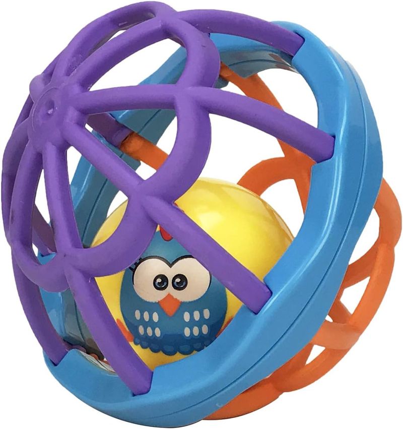 Chocalho em formato de bola, colorido para atrair a atenção do bebê para a brincadeira • Internamente possui bola com desenho da Galinha Pintadinha Mini que faz sons de chocalho • Possui estrutura macia, que pode ser utilizada como mordedor para ajudar a acalmar e aliviar a gengiva do bebê no crescimento dos dentes