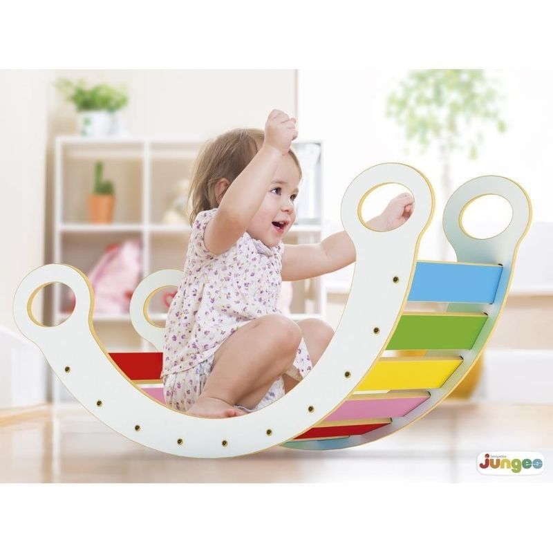 AVISO: IMAGENS MERAMENTE ILUSTRATIVOS!!! Gangorra Pikler da Junges em madeira de reflorestamento (MDF) com pintura atóxica. Produto resistente, ecológico, prático e fácil de montar (acompanha kit de montagem com chave), sendo um ótimo brinquedo para estimular a criatividade, imaginação, autonomia e liberdade da criança. Inspirada na Metodologia Pikler, a gangorra é um brinquedo que estimula a criança ao livre brincar. Além disso, contribui com o desenvolvimento da motricidade e do equilíbrio, permitindo a criança subir, descer, escalar e balançar. . Permite, também, que a criança utilize da sua imaginação tornando-a um balanço, escada, banquinho, mesinha, túnel, ponte, gangorra e casinha/cabana de brincar... ATENÇÃO! Utilizar sob a supervisão de um adulto! Indicado para crianças com peso máximo de 35kg Contém: 1 GANGORRA PIKLER idade: +12 meses Material: Madeira MDF Peso Maximo suportado: 35kg Marca:Junges Dimensões aproximado do produto: 80x40x38 cm