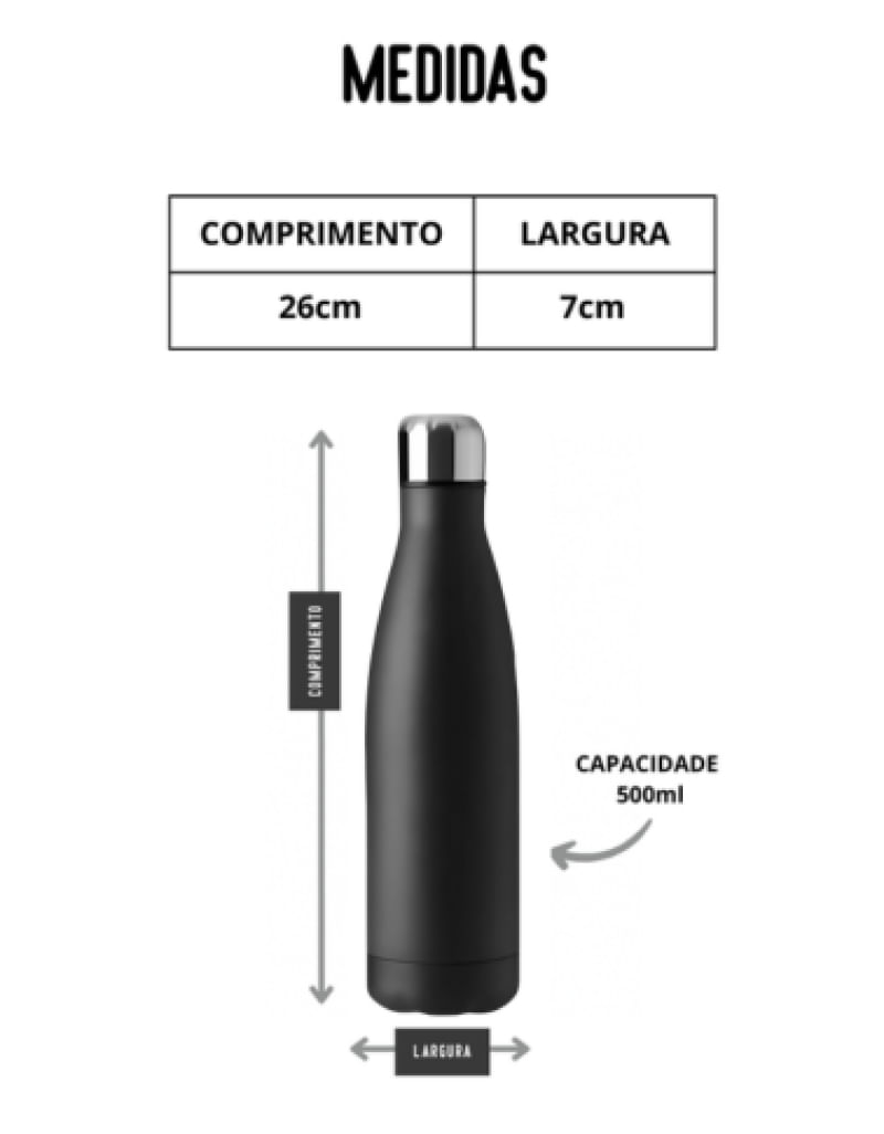 A Garrafa de inox conta com tampa rosqueável e tem capacidade de 500ml. Mantém a temperatura fria por até 4 horas e a temperatura quente por até 1 hora. Produto Importado. BPA FREE.
