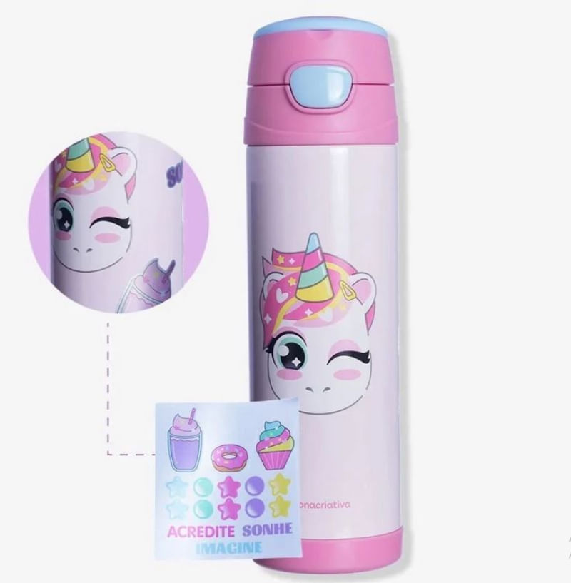 A garrafa é importada, feita em aço inoxidável, possui detalhes incríveis que vão fazer você se apaixonar! Se você busca uma garrafa que te acompanhe na faculdade, trabalho ou escola, você encontrou a companhia perfeita! Com 500ml de capacidade para te hidratar o dia inteiro, com uma tampa de click que evita vazamentos, caso você precise levar na bolsa ou mochila! Feita em aço inox, ajuda a manter a temperatura da sua bebida por até 6h, além de contar com uma cartela de adesivos para você personalizar sua garrafa como quiser e uma alça para carregá-la para onde quiser! Não importa onde é a sua aventura, essa garrafa te acompanha em todos os lugares!