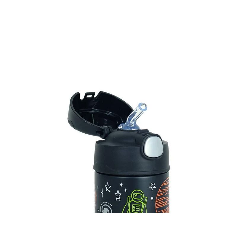 Projetada para mãos pequenas, a Thermos Funtainer F410 permite que a criança abra e feche com facilidade usando apenas uma mão, graças ao seu sistema de abertura intuitivo, ergonômico e higiênico, já que a tampa permanece fechada após o uso, sem contato com o ambiente. O canudo de silicone macio proporciona um toque suave ao beber, enquanto a alça externa integrada facilita o transporte, perfeita para a escola, passeios e atividades ao ar livre.